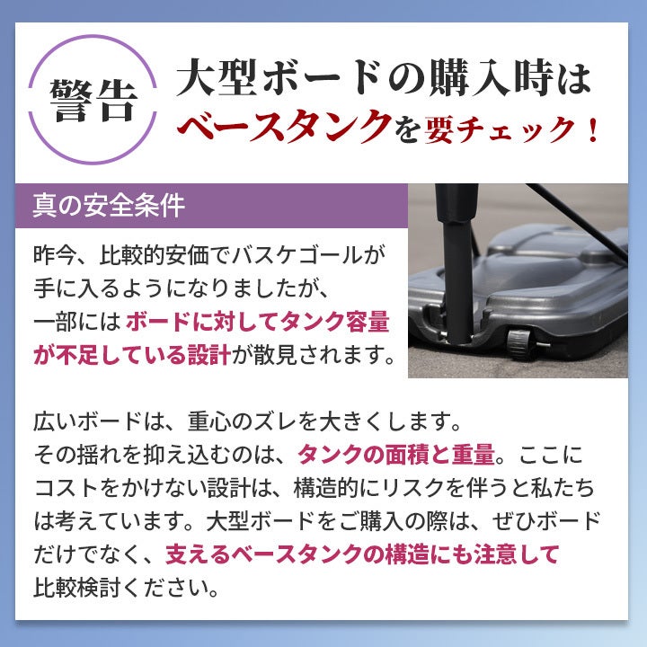 ベースタンクを支柱の後方に配置するレイアウト設計により、ゴール下の足元スペースを広く確保しています。レイアップ後の着地時にタンクにつまずくリスクを減らし、思い切りプレーできる安全性に配慮しています。
