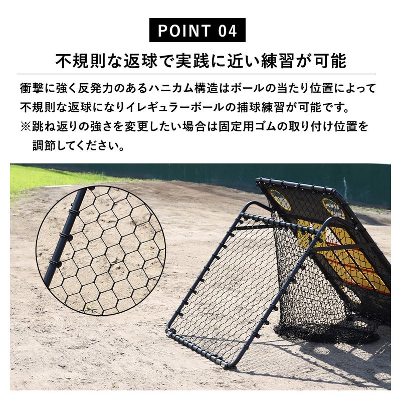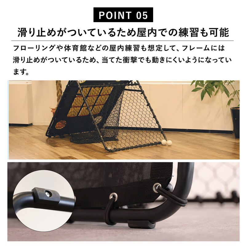 表面はストラックアウトとして、裏面はリバウンダーとして使用可能です。また、フレームの角度を変更することでゴロやフライの練習も行えます。