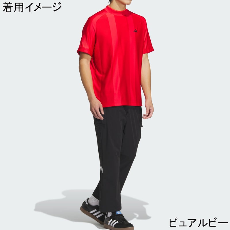 独特な質感のジャカードニット生地に太めの縦ストライプをあしらった、斬新なデザインのゴルフシャツ。