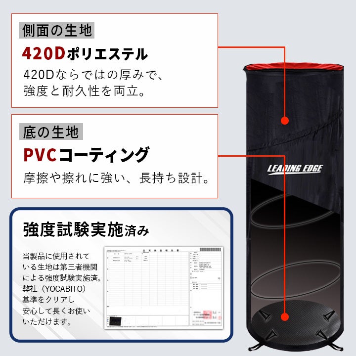 起き上がり人形のような跳ね上がり構造になっており、横から衝撃を与えても簡単に倒れず元の姿勢に戻ります。また、極太スチールの採用や4カ所の留め具固定により、耐久性と安全性を高めています。