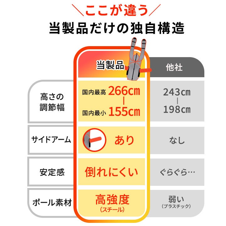 サイズは約幅53cm×奥行39cm×高さ266cmです。ポールの高さ調整ネジを使用することで、練習相手の身長やシチュエーションに合わせて高さを変更することが可能です。