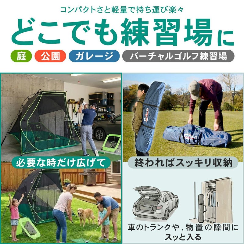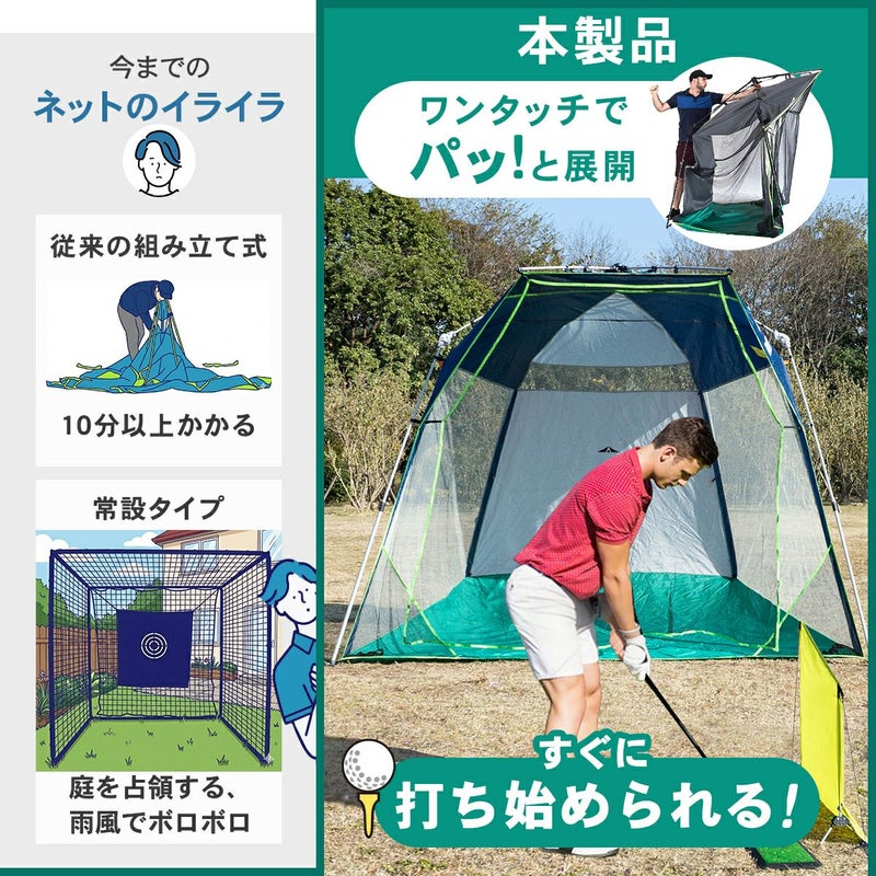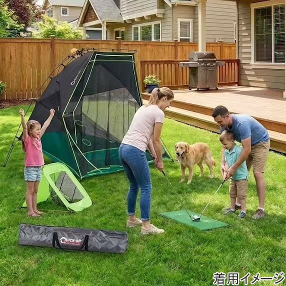 「QUICK-UP GOLF RANGE」は、思い立った瞬間に広げて練習を開始できる、革新的な家庭用ゴルフネットです。