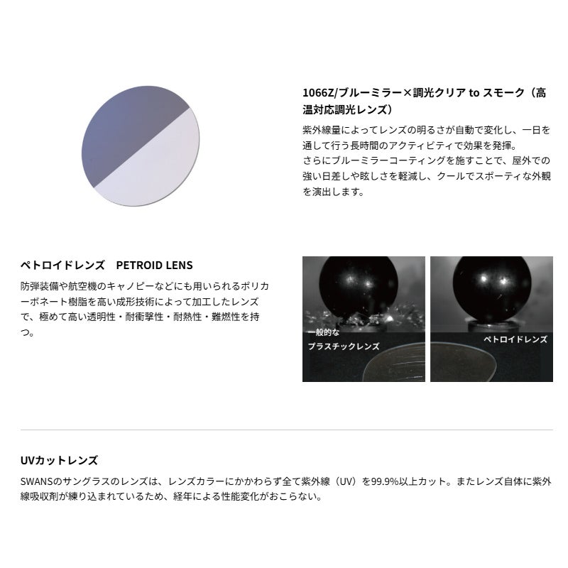 SWANSのサングラスのレンズは、レンズカラーにかかわらず全て紫外線(UV)を99.9%以上カット。