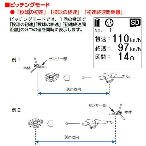 ピッチングモードでは、1回の投球で「投球の初速」「投球の終速」「 初速終速間距離」の3つの値を同時に表示します。