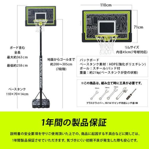 [バックボードサイズ] 44”(約110×71cm) HDPP製(強化ポリエチレン製カラーボード) [リムサイズ] 直径45cm 5号 6号 7号球対応 [ベース] HDPE(強化ポリエチレン)製 [ベースタンクサイズ] 約110×70×14cm [ポール] スチール製 パッド付き [高さ調整] テレスコープ式 ゴールリング高さ約2.3m~3.05mまで [ボードを含めた高さ] 約2.91m~3.66m ※天井高が上記サイズ以下の場所では使用・保管が出来ません。必ず事前にご確認ください。 [重量] 約21kg(ベースタンクが空の状態) [その他] ・組立式(大人3名以上推奨) ※日本語組立説明書付き ・ベースタンクに水もしくは砂を入れて使用ください。 ・凍結の可能性がある場所では砂を使用ください。 ・移動用ローラー付き [組み立て時必要工具等](商品に同梱されておりません) ・10mm/13mm/14mm/17mm(2)対応レンチ ・プラスドライバー ・砂及び砂用じょうご、もしくは水及びホース |