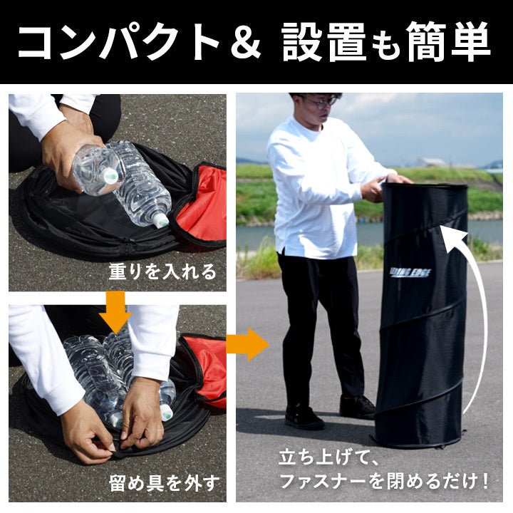 起き上がり人形のような跳ね上がり構造になっており、横から衝撃を与えても簡単に倒れず元の姿勢に戻ります。また、極太スチールの採用や4カ所の留め具固定により、耐久性と安全性を高めています。