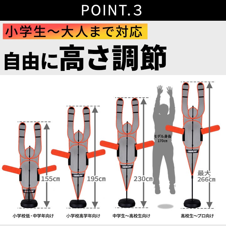 ポールの高さ調節ネジを使用することで、練習相手の身長や想定するシチュエーションに合わせて高さを変更できます 。