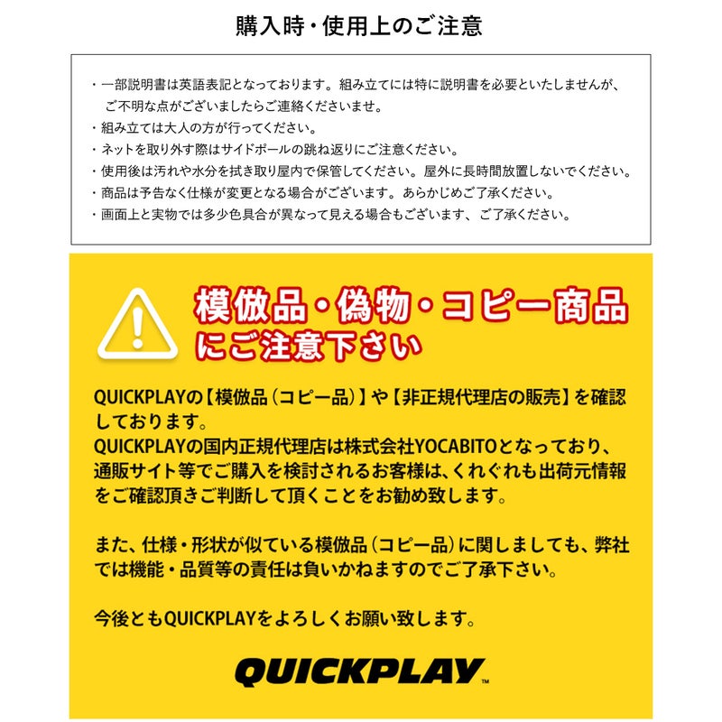 ・商品の仕様変更に伴い、収納バッグ、ネット外枠のQuickPlayロゴ部分のカラーが黒色から緑色へ、 ネット留め具のカラーが赤色から緑色へ順次変更しております。