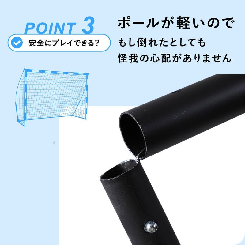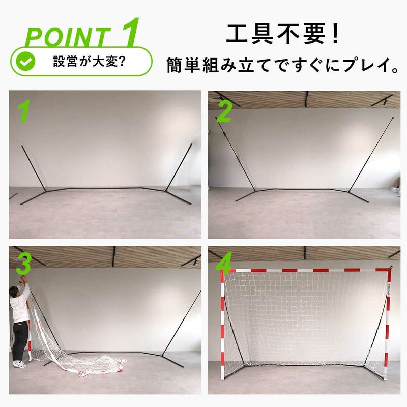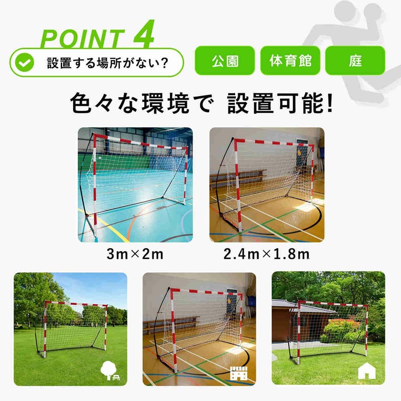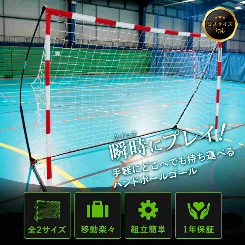 サイズは幅3m×高さ2m(9.8×6.5ft)です。ハンドボールの公式サイズに対応しており、本格的な練習や試合に適しています。