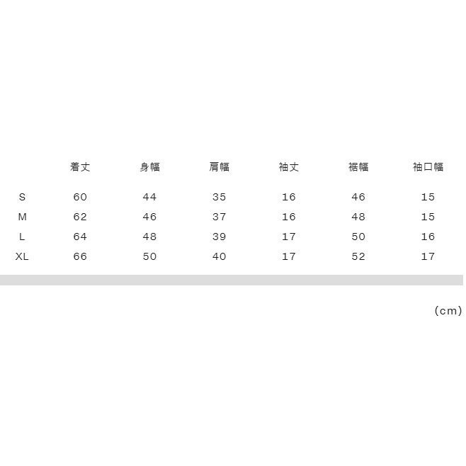 サイズ寸法・実寸(cm)S:着丈60、身幅44、肩幅35、袖丈16、裾幅46、袖口幅15