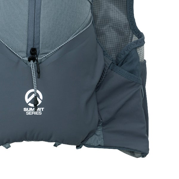ショルダーハーネスにボトルポケットと、補給食やグローブなどをまとめて収納しやすい大型のスリットポケット、両サイド脇下のストレッチスリットポケットを装備。