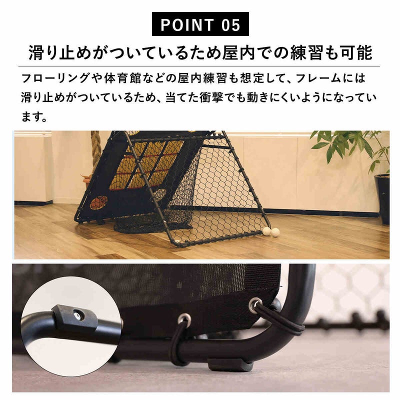 表面はストラックアウトとして、裏面はリバウンダーとして使用可能です。また、フレームの角度を変更することでゴロやフライの練習も行えます。