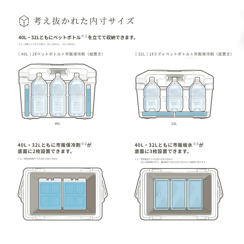 ●40L・32Lともに市販保冷剤※2が底面に2枚設置できます。