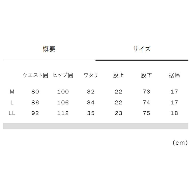 サイズ寸法・実寸(cm)M:ウエスト囲80、ヒップ囲100、ワタリ32、股上22、股下73、裾幅17