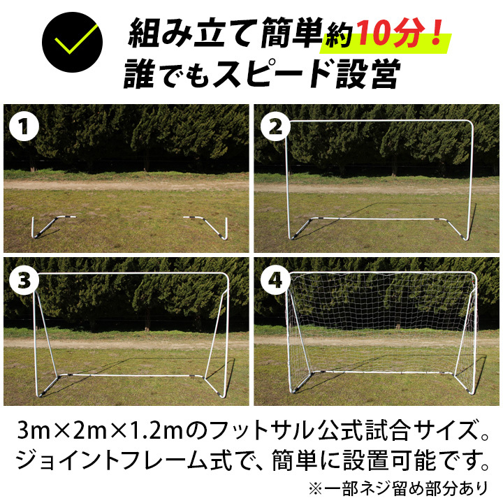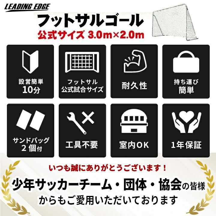 他の画像を見る 即納 リーディングエッジ(LEADING EDGE) 屋内 屋外兼用 フットサルゴール 3m×2m 公式サイズ キャリーバッグ&土嚢袋付き ESFG-001 販売価格 ¥ 12,800 税込 %OFF 本格的なフットサルがどこでも楽しめるポータブルフットサルゴール! 詳細を見る お気に入り登録