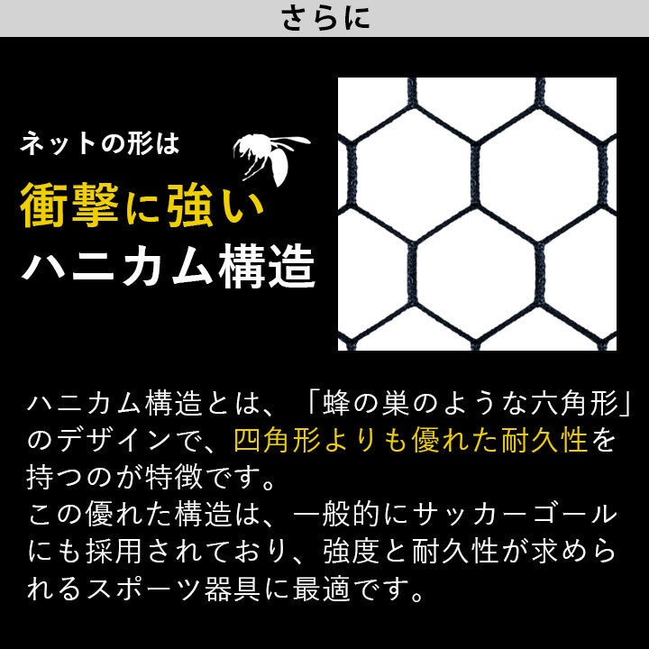 独自構造(意匠権取得済み)のハニカム(六角形)ネットを採用しており、高い反発力を備えています。ボールが不規則にならずしっかりと跳ね返ってくるため、リズムの良い連続したトレーニングが可能です。
