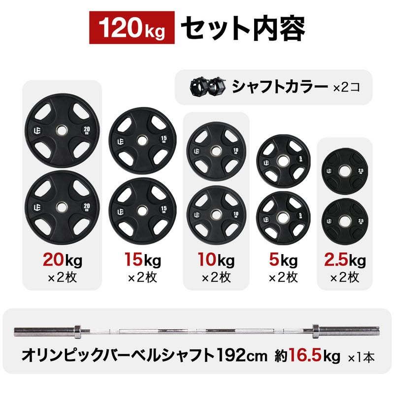 バーベルシャフト(192cm)、バーベルプレート、およびシャフト用のカラー(留め具)が含まれた、計120kgのセットとなっております。