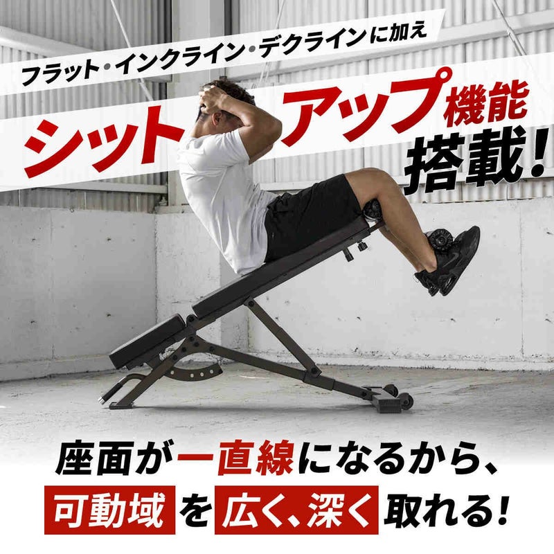 はい、インクラインやフラットに加え、デクラインやシットアップ機能も搭載しており、付属のフットレストで足を固定して効率的にトレーニングを行えます。