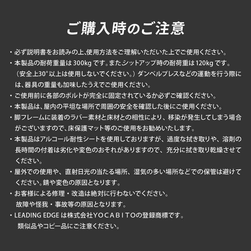 高重量のダンベルやバーベルトレーニングに対応する300kgの耐荷重がありますが、シットアップ(腹筋運動)使用時は120kgまでとなります。