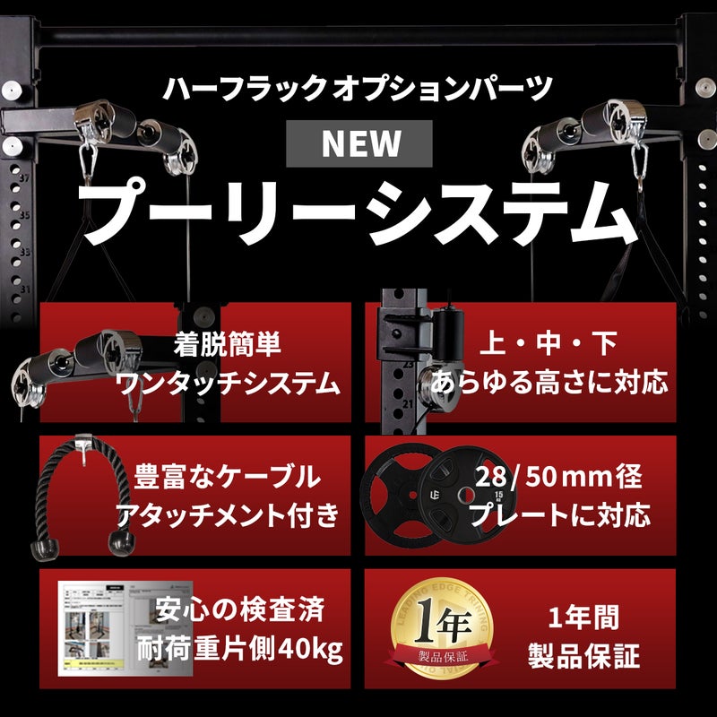 LEADING EDGEのハーフラック(LE-HR100、LE-HR100V)に取り付けるだけで、ジムさながらのケーブルトレーニングが可能になります。