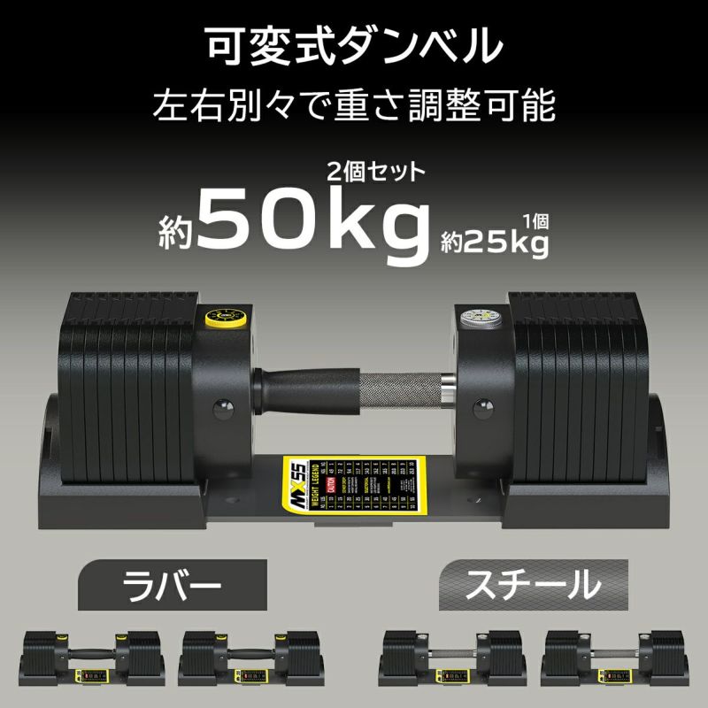 Contoured Textured Handles(コンタード・テクスチャード・ハンドル)を装備したMX55CR Rapid Change Dumbbell Systemは、ダンベル片側あたり最大25.3 kgの重量があります。