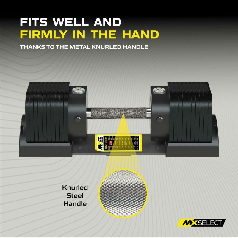 MX55KS Rapid Change Dumbbell Systemは、Knurled Steel Handles(ローレット加工スチールハンドル)を装備しており、ダンベル片側あたり最大25.3 kgの重量があります。