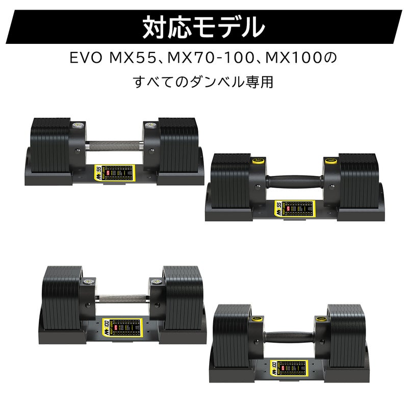 EVO MX55、MX70、MX100 Rapid Change Dumbbellのすべてのウェイトクレードル(台座)に対応しています。