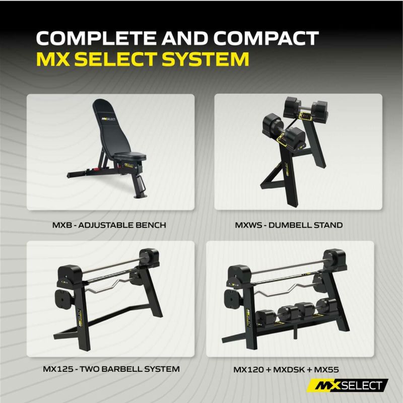 MX125 Rapid Change Dual Barbell Systemには、ローレット加工が施されたスチール製のストレートバーとEZカールバー、120 lbs (53.7 kg)のウェイト、そして2枚の1.13 kg アドオン マイクロウェイトプレートが含まれており、これら全てがスタイリッシュなスタンドに収まります。