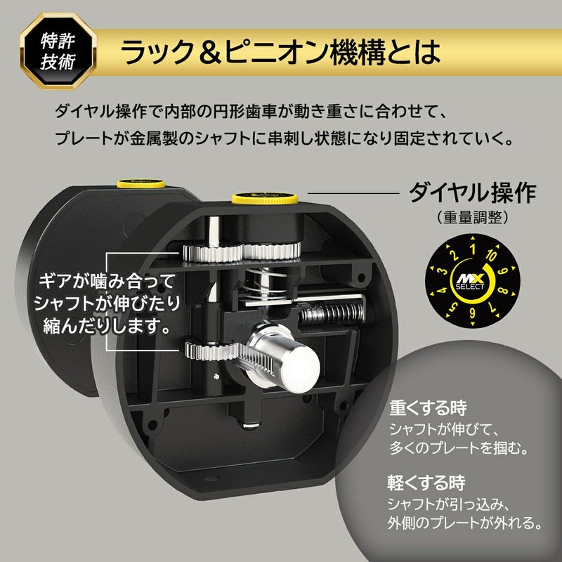 MX70 Rapid Change Dumbbell Systemは、MX SELECT独自の特許取得済みラック&ピニオン設計と、安全なPositive Lock Systemを採用しています。