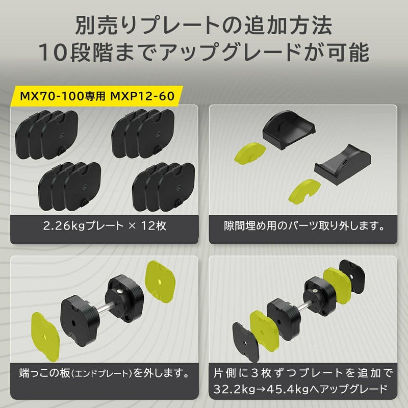 さらに、別売りのアドオンプレート アップグレードキット(MXP12-60)を追加導入することで、基本設定が10段階に拡張され、アドオン マイクロウェイトプレートを併用すれば最大20段階の重量調整が可能になります。