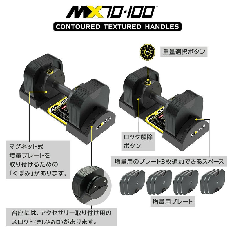 MX70 Rapid Change Dumbbell Systemは、Contoured Textured Handles(コンタード・テクスチャード・ハンドル)を装備しており、ダンベル片側あたり最大32.2 kgの重量があります。