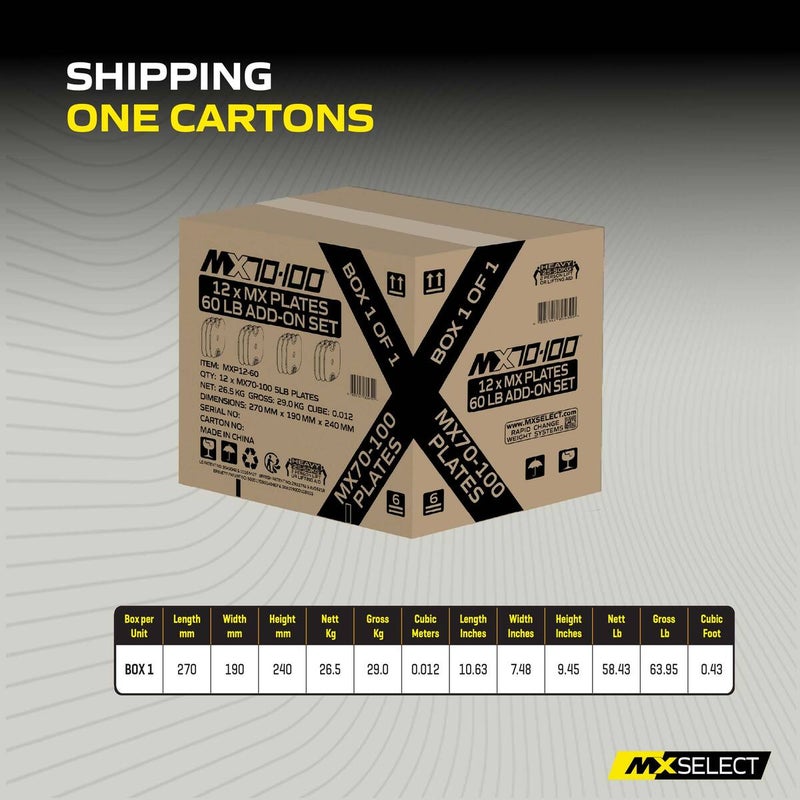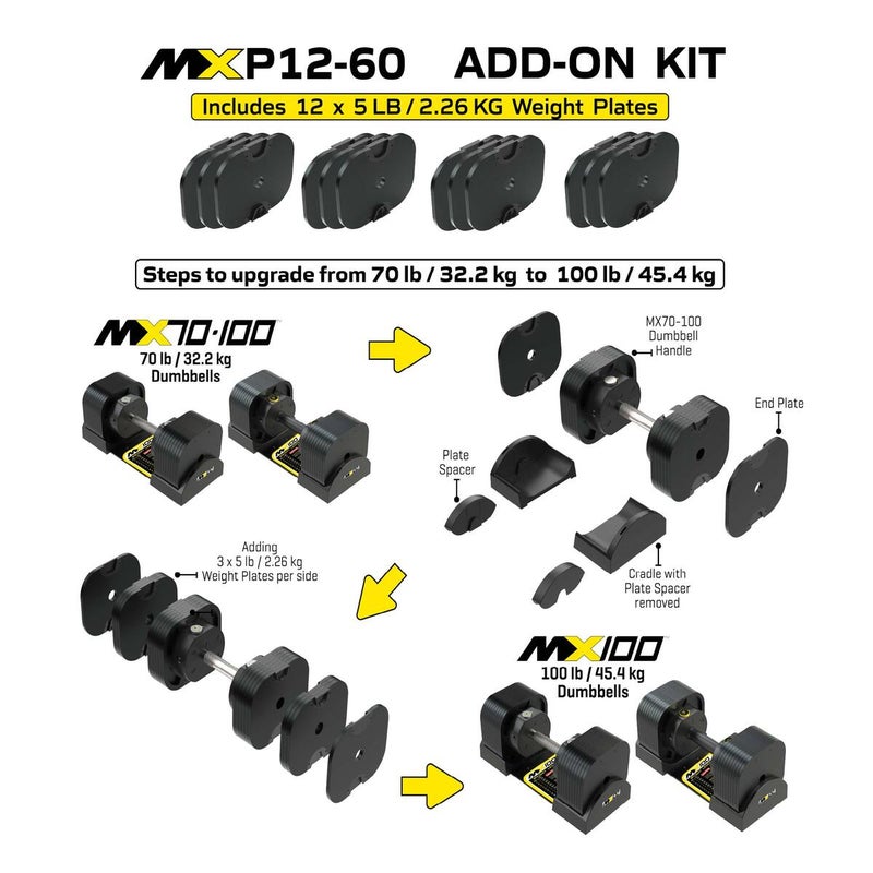 MXP12-60 アップグレードキットには、2.26kgのウェイトプレートが計12枚付属しており、ダンベル片側につき6枚ずつプレートを追加します。
