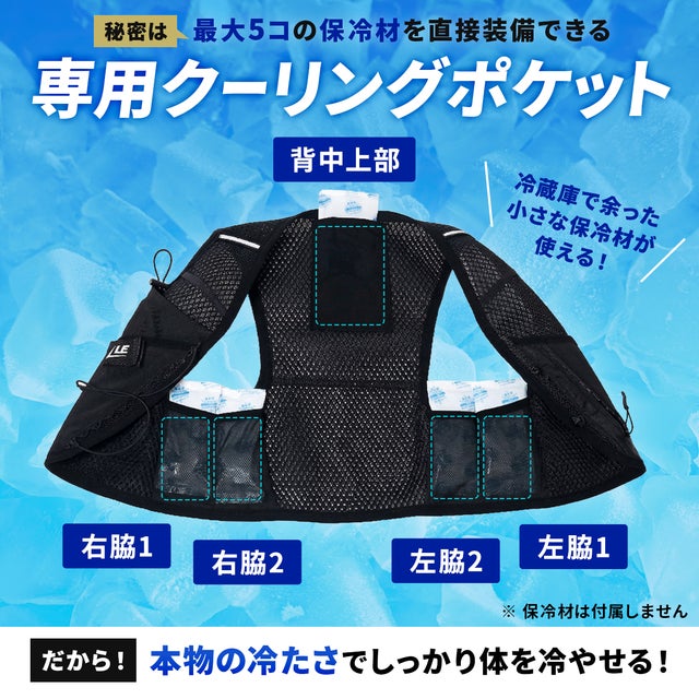 市販の保冷剤が使え、約150gの軽量メッシュ生地で通気性抜群。
