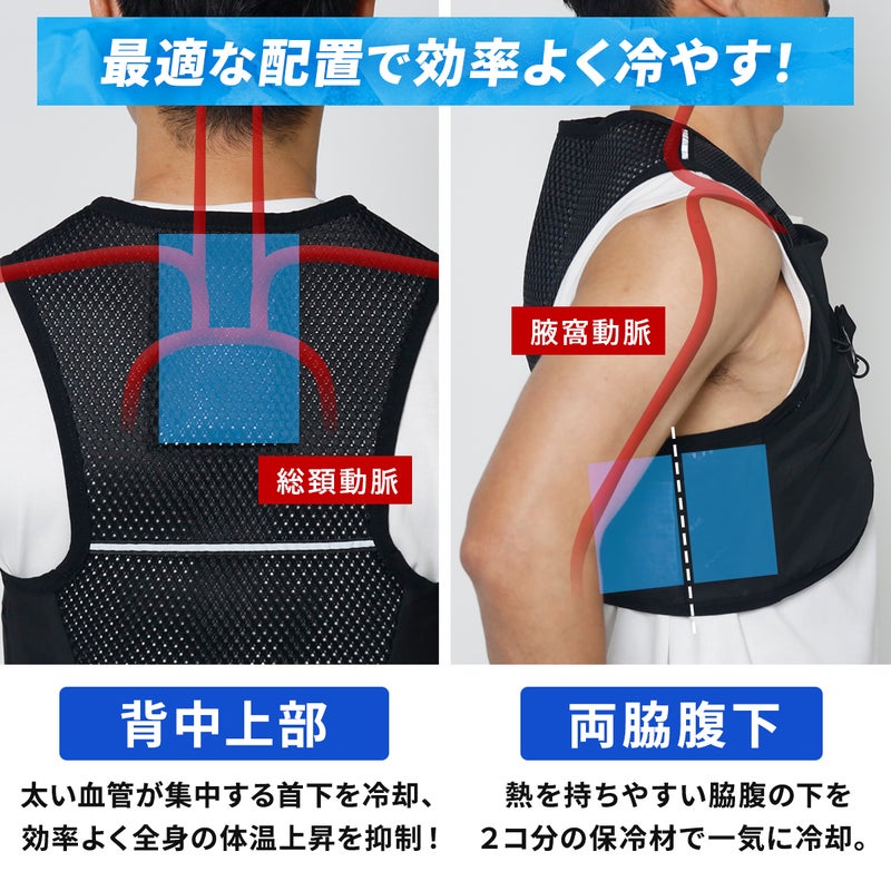 背中と両脇の3点冷却で深部体温を効率的に下げ、夏の練習をサポート。