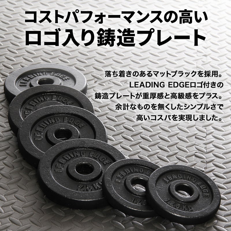 シンプルでコストパフォーマンスの高い、マットブラックの2.5kgプレート2枚セットです。LEADING EDGEのロゴが入った鋳造プレートで、28mmシャフト規格に対応しています。