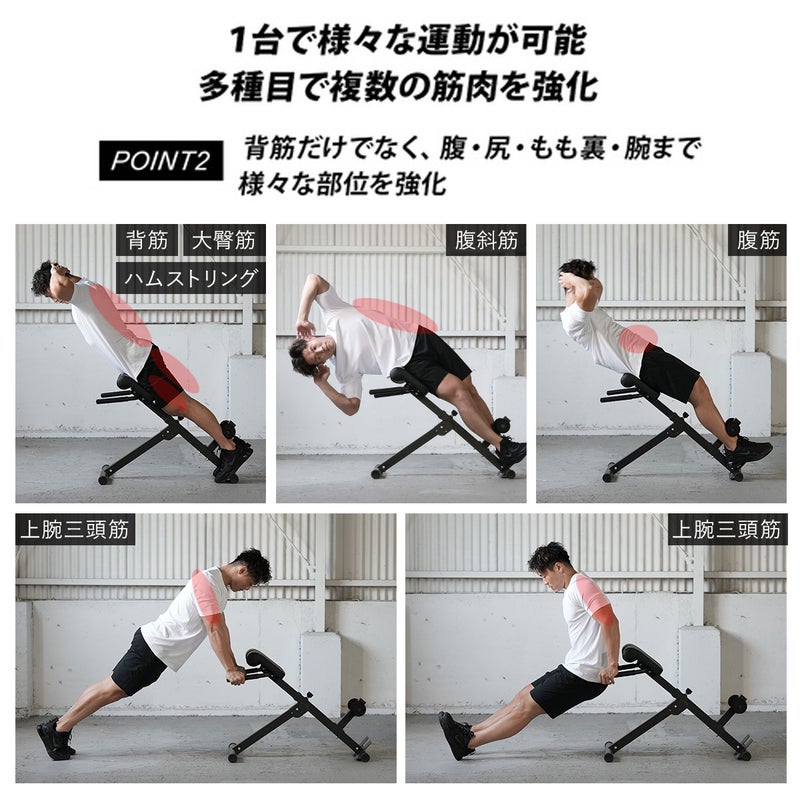 ・これ一台でバックエクステンション・サイドベント・ディップス・プッシュアップ等様々な運動が可能。