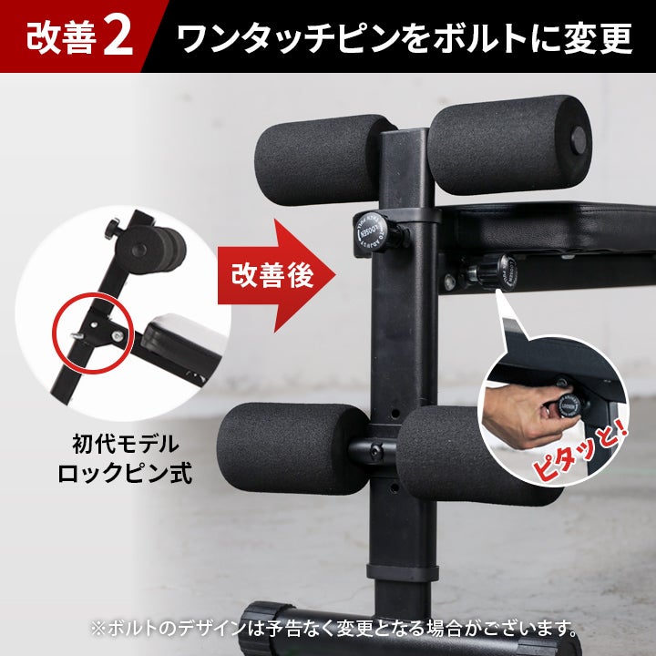 ・各部位の設計を見直し、使用中のガタツキを改善(ピン式⇒ノブボルト式にレッグ固定方法を改良)。