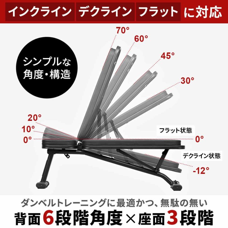 ・角度設定に迷わない、ダンベルトレーニングに最適なインクライン角度(30-45-60-70度)更にデクラインにも対応。