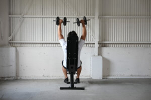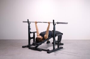 - ベンチに仰向けに寝転がり、両手でバーベルを持つ