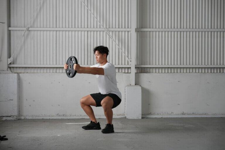 ダンベルを両手に持ってスクワットを行うと、負荷を上げることができます。