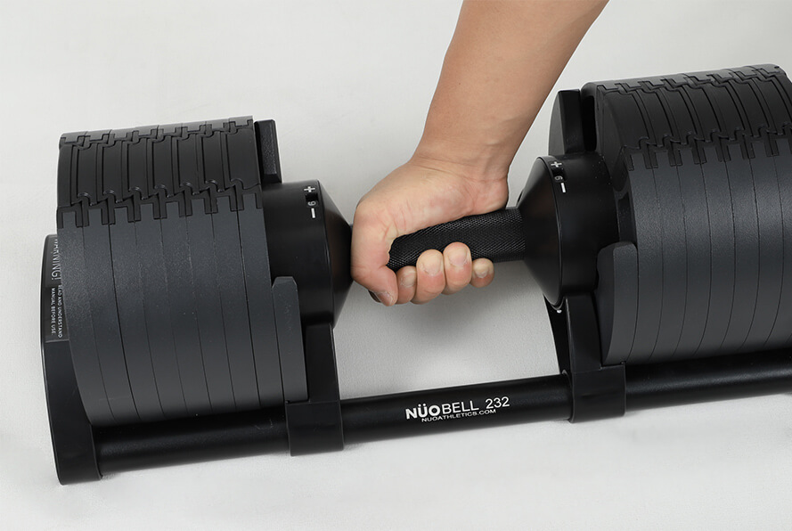 NUOBELL(ヌオベル)は、グリップを回すだけで瞬時に重量変更(4kg/2kg刻み)ができる超高速・省スペースな可変式ダンベルです。