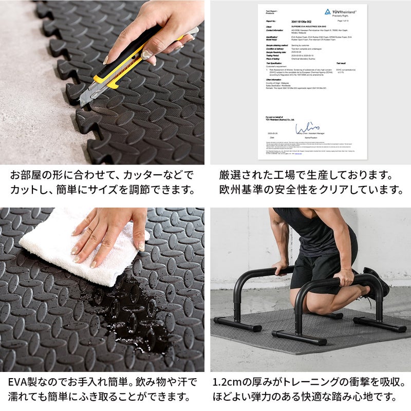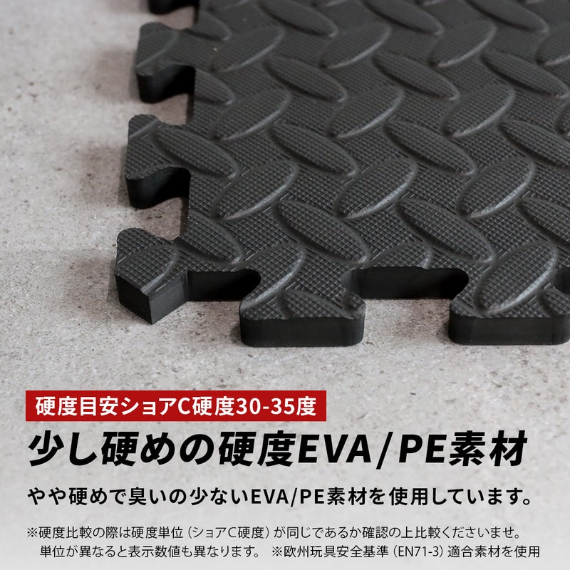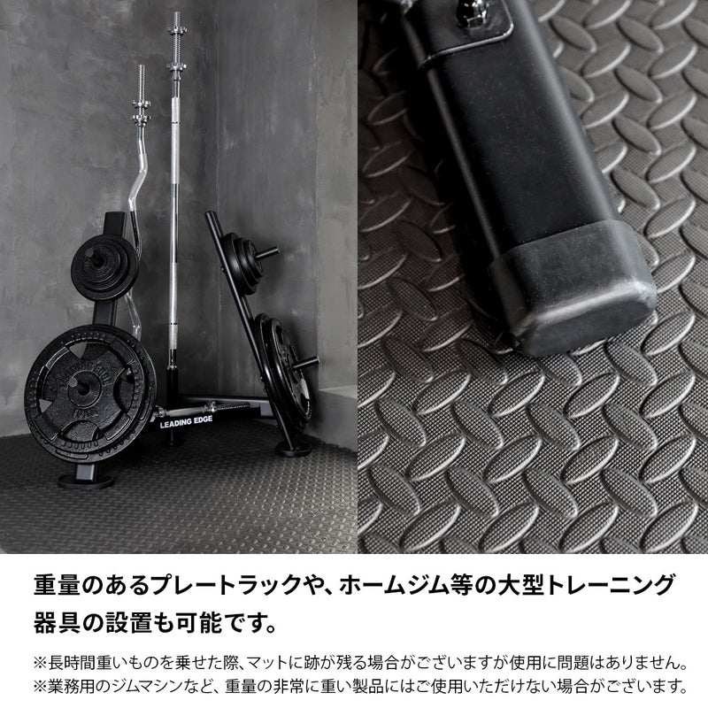 重量のあるトレーニング器具の使用にも対応する、少し硬めのEVA/PE素材を使用しています。ただし、長時間放置すると圧痕が残る可能性がございます。