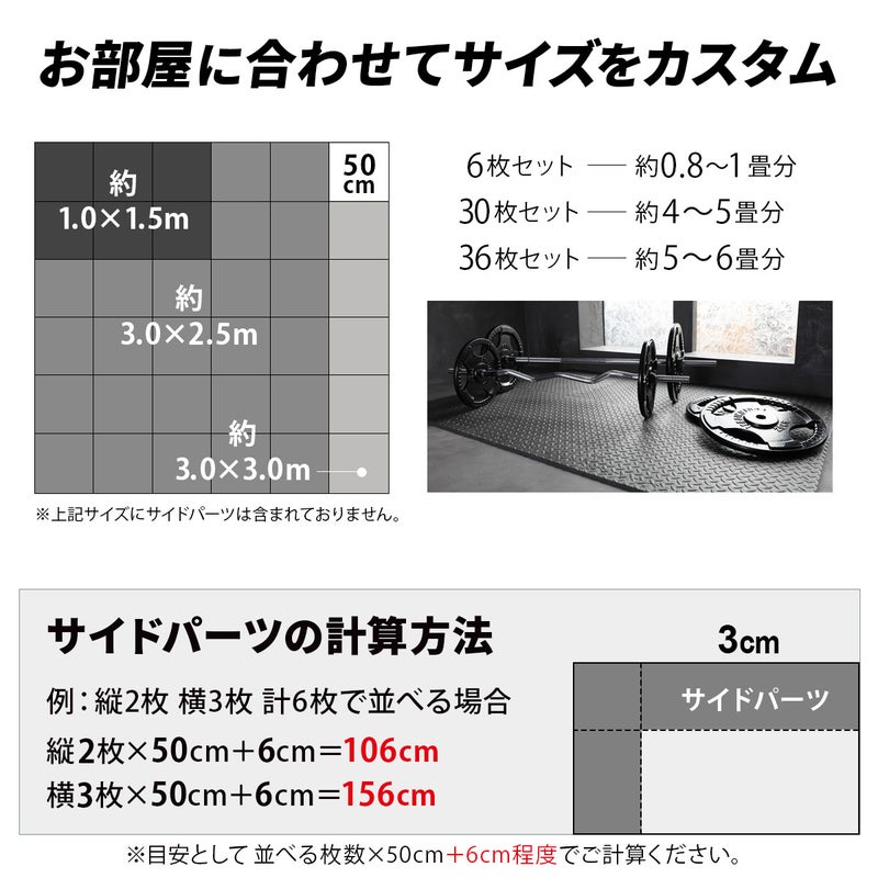 トレーニング器具用や室内の自転車置き場としても丁度良い6枚セットなので幅広い使い方が可能です。