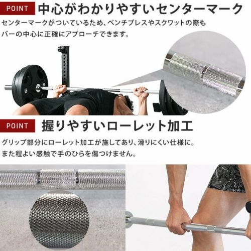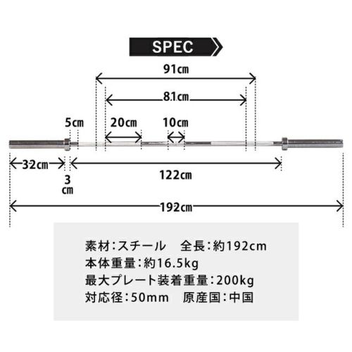 本体寸法:L約1920mm×直径約74mm スリーブ径:50mm 本体重量:約16.5kg 最大プレート装着重量:200kg 構造部材:スチール 原産国:中国 |