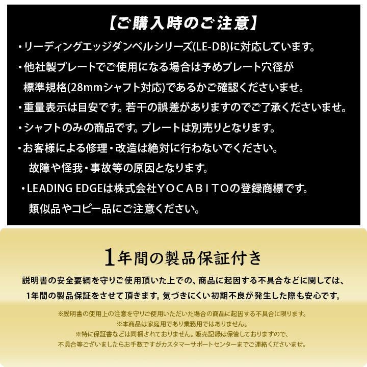 汎用性の高い28mm径のスタンダードシャフトを採用しております。リーディングエッジのダンベルシリーズ(LE-DB/ESDB※シルバーのみ)に対応していますが、他社製プレートをご使用になる場合は予めプレート穴径が標準規格(28mmシャフト対応)かをご確認ください。