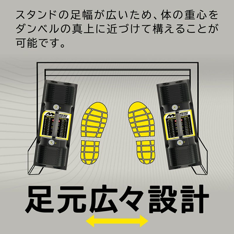 このMX Dumbbell Standはワイドベース設計を採用しており、ユーザーはダンベルをラックから持ち上げる際、体の重心をダンベルの真上に置くことができます。