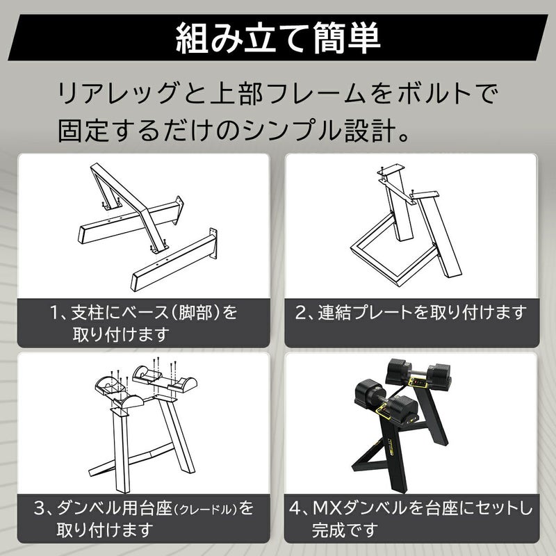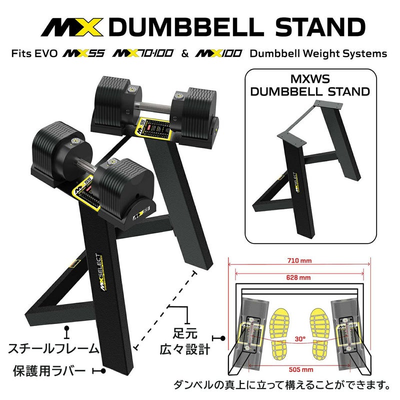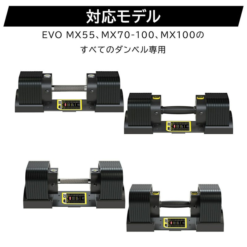 こちらのダンベルスタンド は、EVO MX55、MX70、MX100 Rapid Change Dumbbellのすべてのウェイトクレードル(台座)に対応するよう設計されています。