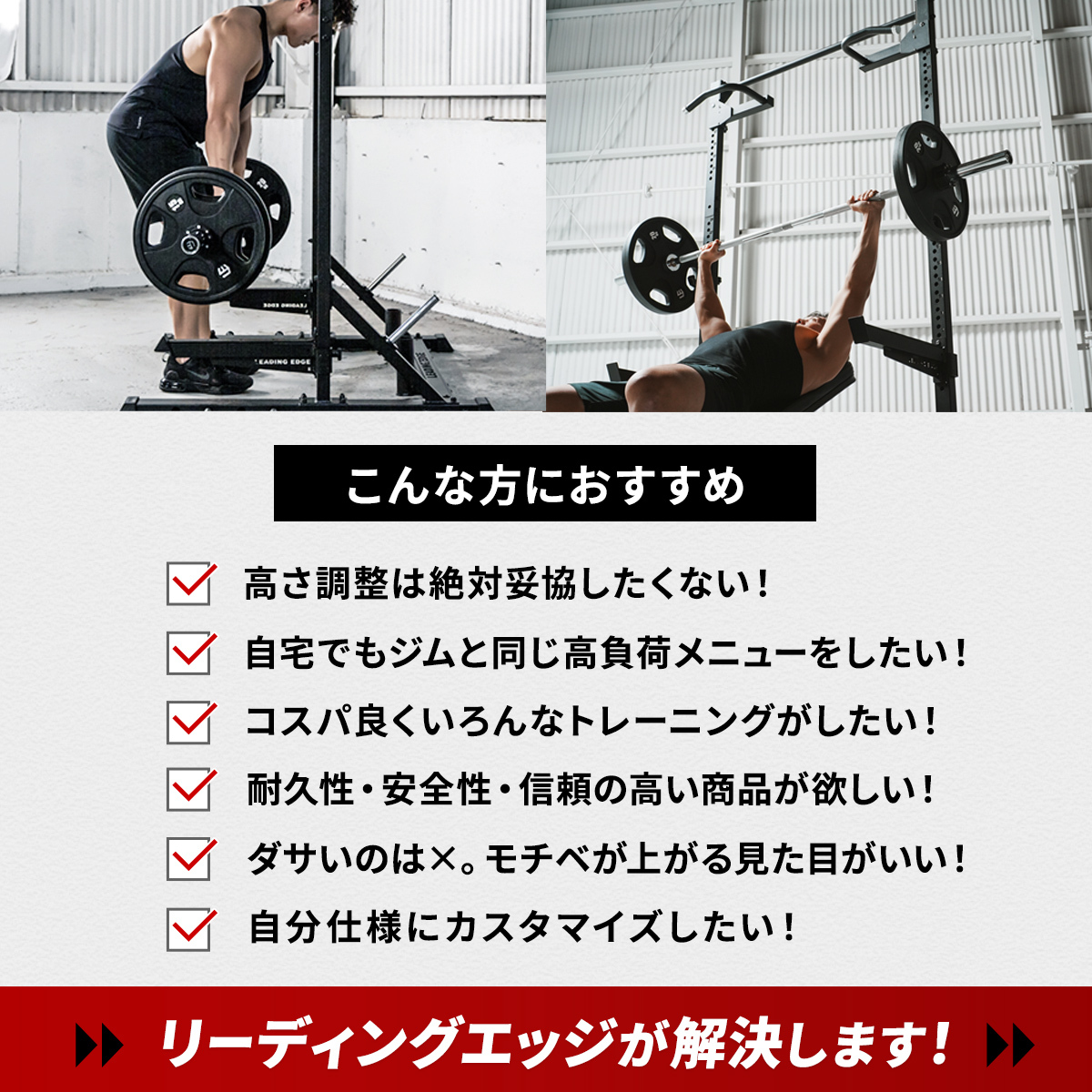 他の画像を見る 離島不可 即納 再入荷 12/10まで10%OFFクーポン リーディングエッジ(LEADING EDGE) カスタムパワーラック LE-CRH LE-CRP & スミスマシン アタッチメント LE-CRS 販売価格 ¥ 198,000 税込 %OFF ジムを超える自由度を自宅に。カスタムハーフラック、拡張する可能性。 詳細を見る お気に入り登録