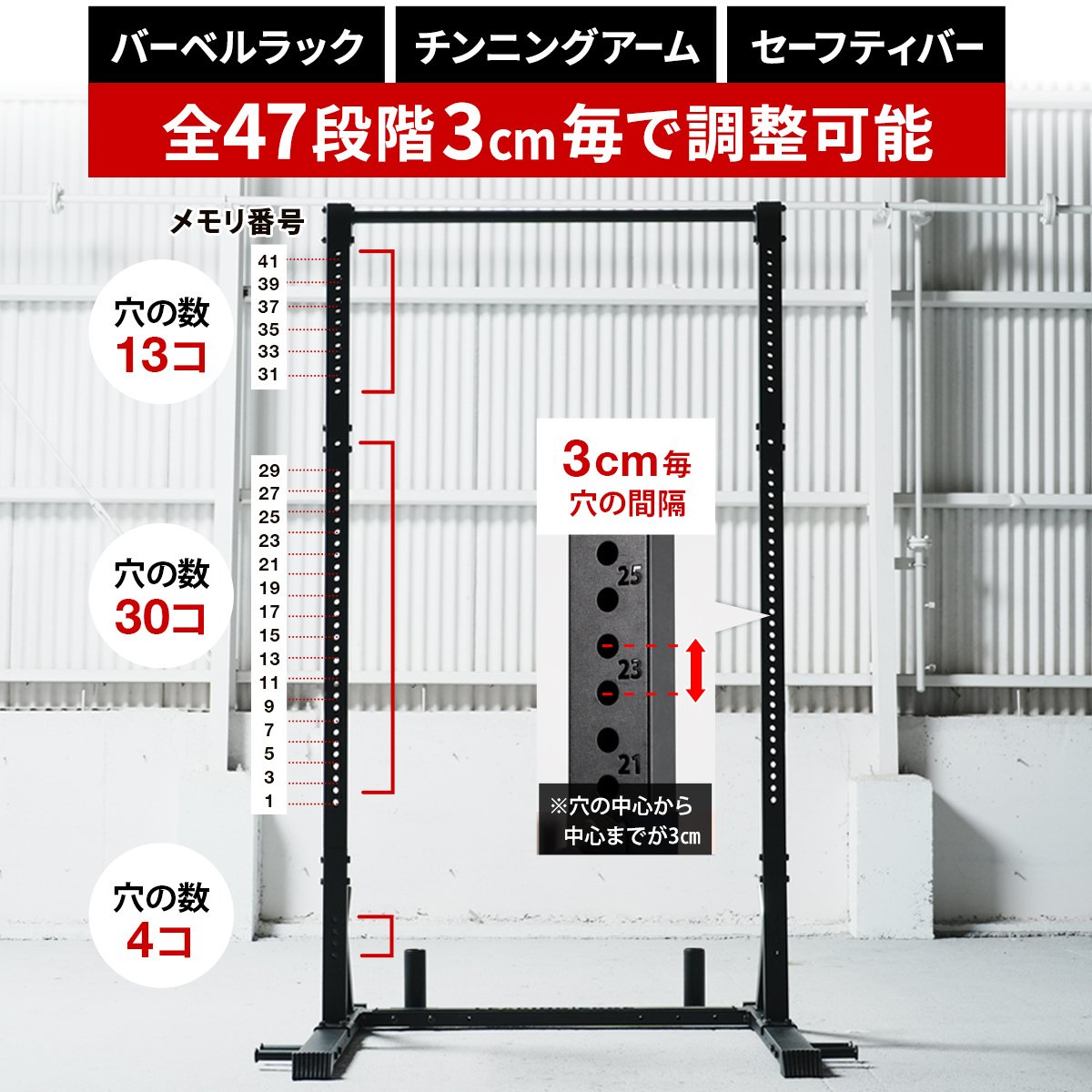 他の画像を見る 即納 リーディングエッジ(LEADING EDGE) ハーフラック多段階高さ調整 【47段階×3cmの高さ調整/44cmのセーフティバー 耐荷重300kg】 ディップス チンニング 省スペース バーベル ワイドフレーム LE-HR100V 販売価格 ¥ 39,800 税込 %OFF 圧倒的本格派。コスパ×高負荷対応を実現、使い心地にこだわったハーフラック。 詳細を見る お気に入り登録