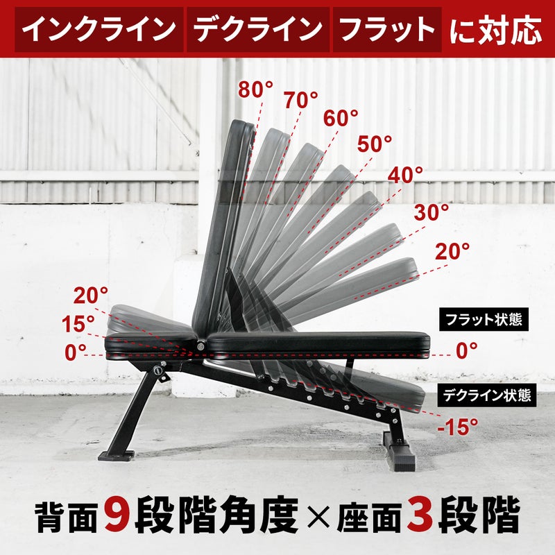 ・角度設定に迷わない、ダンベルトレーニングに最適なインクライン角度(20-30-40-50-60-70-80度)更にデクラインにも対応。